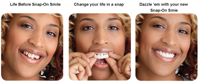 Snap-On Smile is a patented, easy and painless way to obtain a beautiful smile. It was invented by a dentist who realized that not everyone can afford thousands of dollars to get a Hollywood smile make-over. After years of extensive research and development, your dentist can now provide you with a Snap-On Smile that is thin and strong with the look of natural teeth. You can eat and drink with your Snap-On Smile. It’easy to care for and can be a temporary or permanent cosmetic solution. It’ available for upper and lower